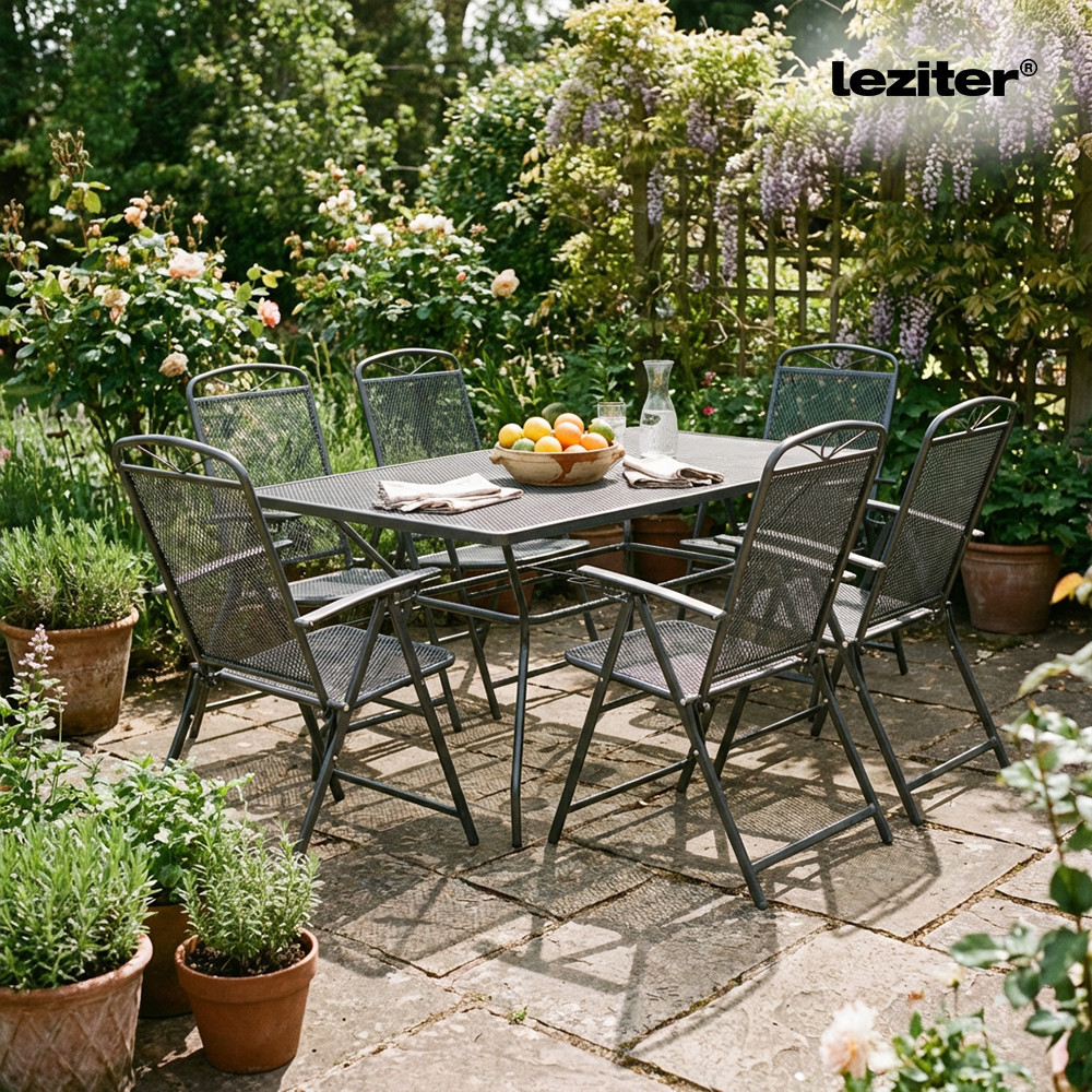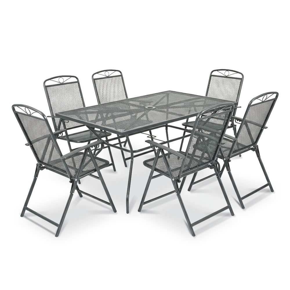 A Melfi 6+1 kerti bútor garnitúra szett antracit színben egy nagyméretű Melfi téglalap alakú kerti asztalt és 6 db kényelmes Melfi karfás széket tartalmaz, stabil acél szerkezetével, korrózióálló és porszórt felületkezelésével, valamint modern hálós kialakításával ideális választás családi étkezésekhez és baráti összejövetelekhez kertben, teraszon vagy erkélyen.