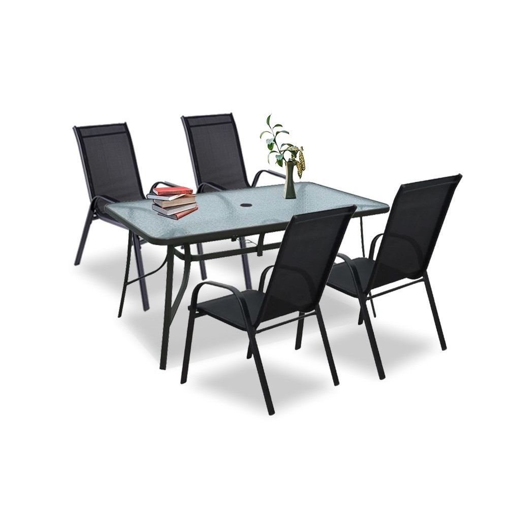 A modern kivitelű kerti bútorkészlet egy kerti üveglapos asztalt és 4 széket tartalmaz. A székek teherbírása 120 kg. A bútorokat 4 fő számára tervezték. A székek és az asztal lábazata fémből készül. Az asztallap 5 mm-es edzett üvegből készült, amely ellenáll a kisebb karcolásoknak. Az textilén szék ülésanyaga ellenáll az időjárási viszonyoknak. Előnye az ergonómikusan profilált ülés és karfa, amelyek tehermentesítik a vállakat pihenés közben.