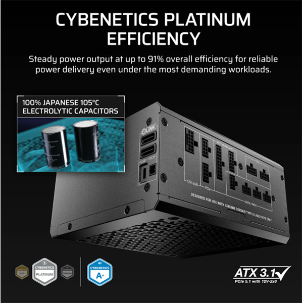 CORSAIR Tápegység Moduláris, iCUE LINK HXi SHIFT Series, HX1000i SHIFT, 1000 Watt, Cybenetics Platinum