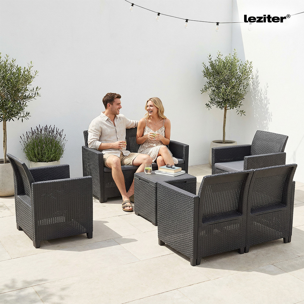 Ez a Grafit színű rattan hatású kerti bútor szett két fotellel, egy 6 személyes sarokkanapéval és egy tárolós asztallal rendelkezik, amelyeket időjárásálló műanyagból készítettek, így nem kell aggódnod a UV sugárzás hatásaitól sem. A fotel magassága: 74 cm, szélessége: 63 cm, hossza: 65 cm. A fotel és a kanapé párnával rendelkezik, mely kényelmessé teszi és színben passzol a bútorhoz. Az asztal magassága: 37 cm, szélessége: 37 cm, hossza: 37. Az asztal több funkciós, így a tároló részében elrejtheted a kerti eszközöket.