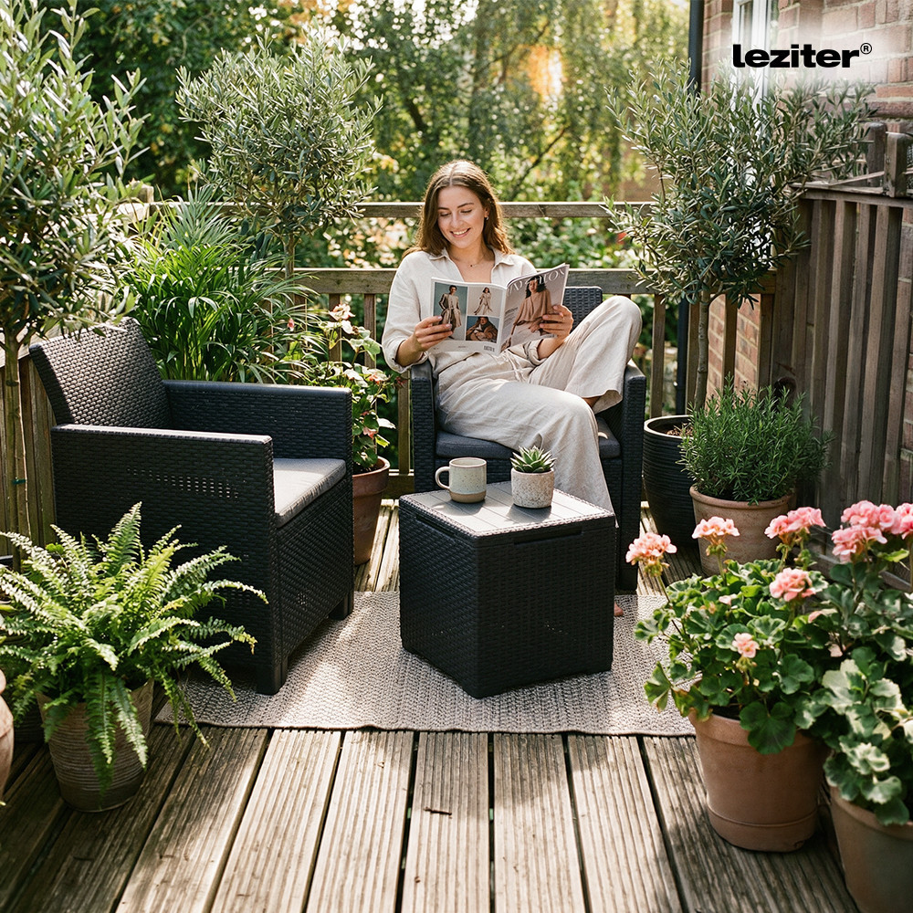 Ez a Grafit színű rattan hatású kerti bútor szett két fotellel, egy tárolós asztallal rendelkezik, amelyeket időjárásálló műanyagból készítettek, így nem kell aggódnod a UV sugárzás hatásaitól sem. A fotel magassága: 74 cm, szélessége: 63 cm, hossza: 65 cm. A fotel párnával rendelkezik, mely kényelmessé teszi és színben passzol a bútorhoz. Az asztal magassága: 37 cm, szélessége: 37 cm, hossza: 37. Az asztal több funkciós, így a tároló részében elrejtheted a kerti eszközöket.