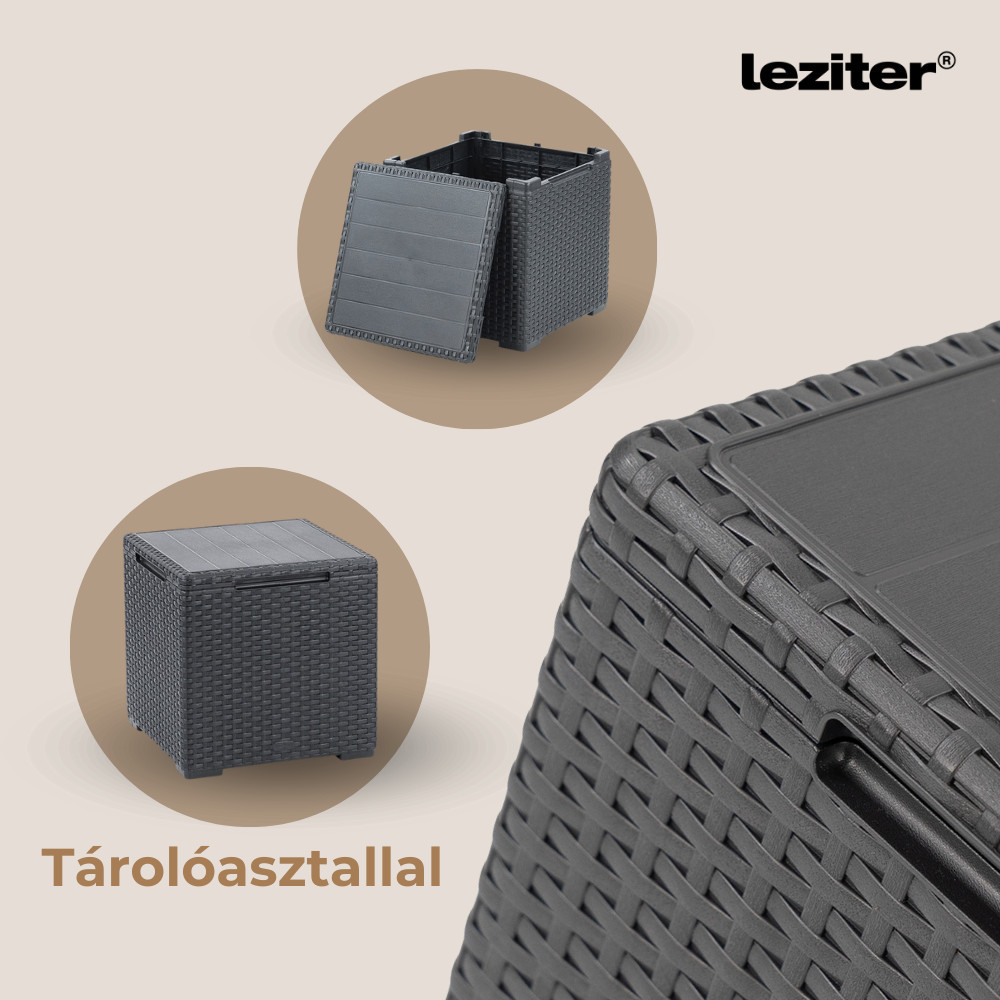 Ez a Grafit színű rattan hatású kerti bútor szett két fotellel, egy 9 személyes sarokkanapéval, egy 2 személyes kanapéval és egy tárolós asztallal rendelkezik, amelyeket időjárásálló műanyagból készítettek, így nem kell aggódnod a UV sugárzás hatásaitól sem. A kanapé magassága: 74 cm, szélessége: 113 cm, hossza: 65 cm. A kanapé párnával rendelkezik, mely kényelmessé teszi és színben passzol a bútorhoz. Az asztal magassága: 37 cm, szélessége: 37 cm, hossza: 37. Az asztal több funkciós, így a tároló részében elrejtheted a kerti eszközöket.