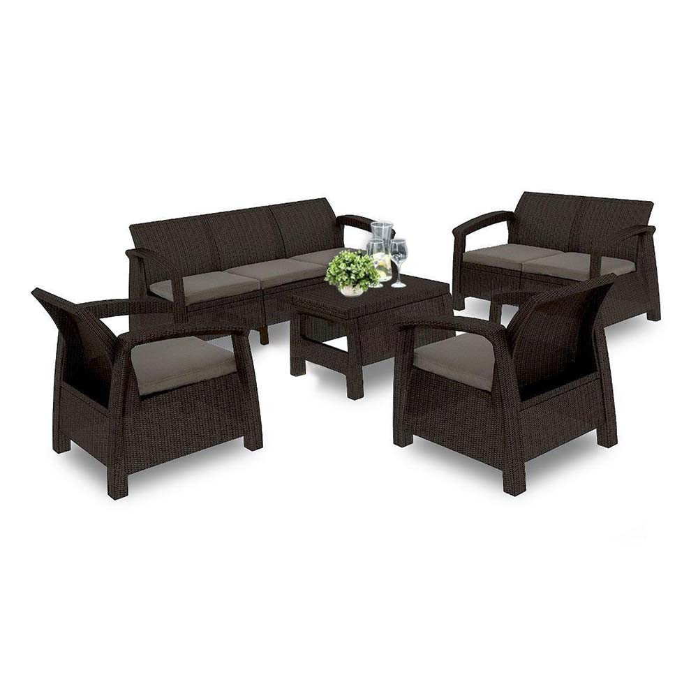 A bemutatott Corfu Set Max kerti bútorkészlet kényelmes kétüléses kanapéból és háromüléses kanapéból, két kényelmes kartámaszos fotelből és egy praktikus dohányzóasztalból áll . 7 személy befogadására képes. A polipropilén bútorok nagyon praktikusak és ellenállnak a kedvezőtlen időjárási viszonyoknak, például esőnek vagy fagynak. Könnyen tisztítható nedves ruhával és kis mennyiségű folyadékkal. A bútor további előnye a kényelme, amelyet kényelmes párnák biztosítanak. A párnahuzatok eltávolíthatók és szükség esetén moshatók. Felületüket Teflon védi, melynek köszönhetően megnövekedett nedvességállóságuk.