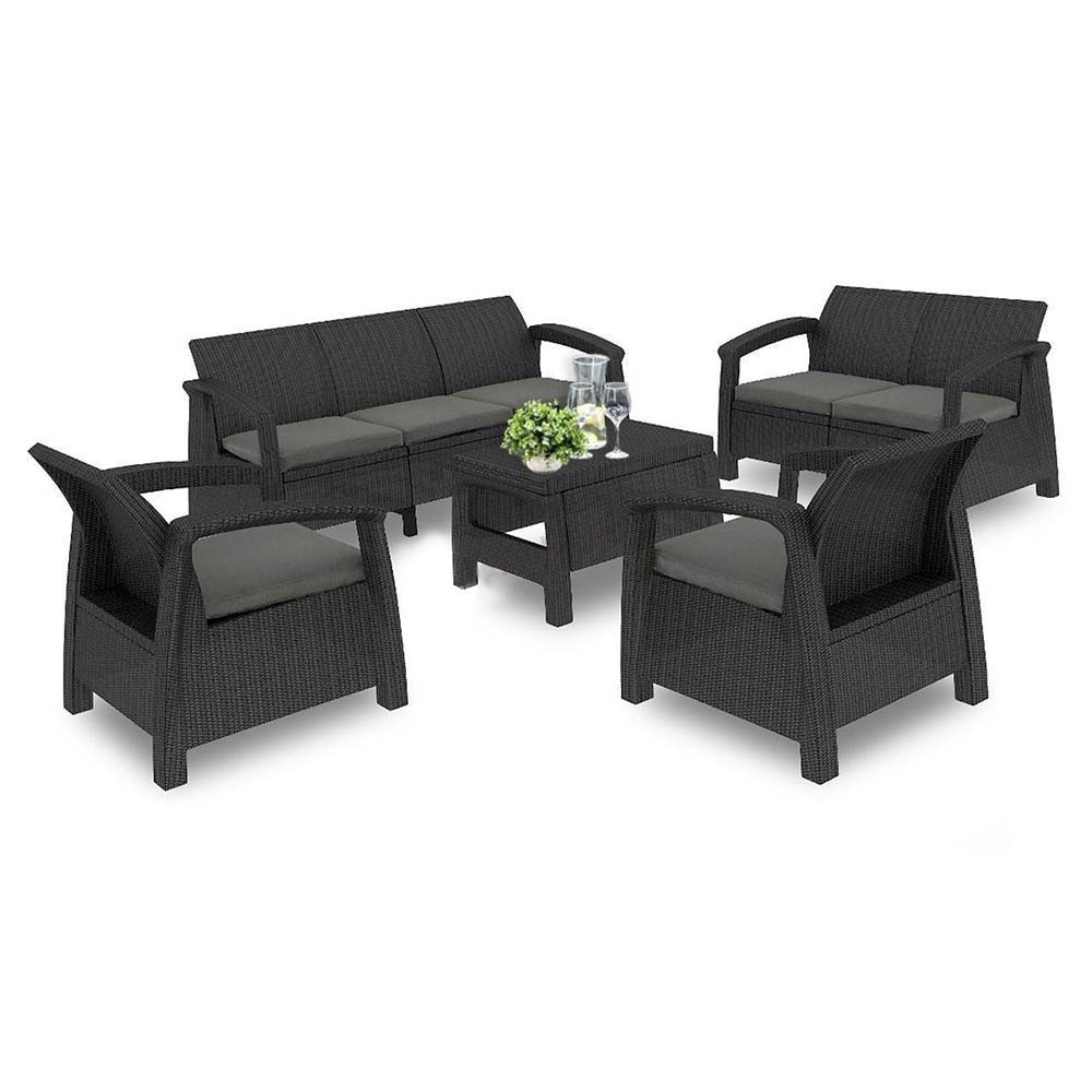 A bemutatott Corfu Set Max kerti bútorkészlet kényelmes kétüléses kanapéból és háromüléses kanapéból, két kényelmes kartámaszos fotelből és egy praktikus dohányzóasztalból áll . 7 személy befogadására képes. A polipropilén bútorok nagyon praktikusak és ellenállnak a kedvezőtlen időjárási viszonyoknak, például esőnek vagy fagynak. Könnyen tisztítható nedves ruhával és kis mennyiségű folyadékkal. A bútor további előnye a kényelme, amelyet kényelmes párnák biztosítanak. A párnahuzatok eltávolíthatók és szükség esetén moshatók. Felületüket Teflon védi, melynek köszönhetően megnövekedett nedvességállóságuk.