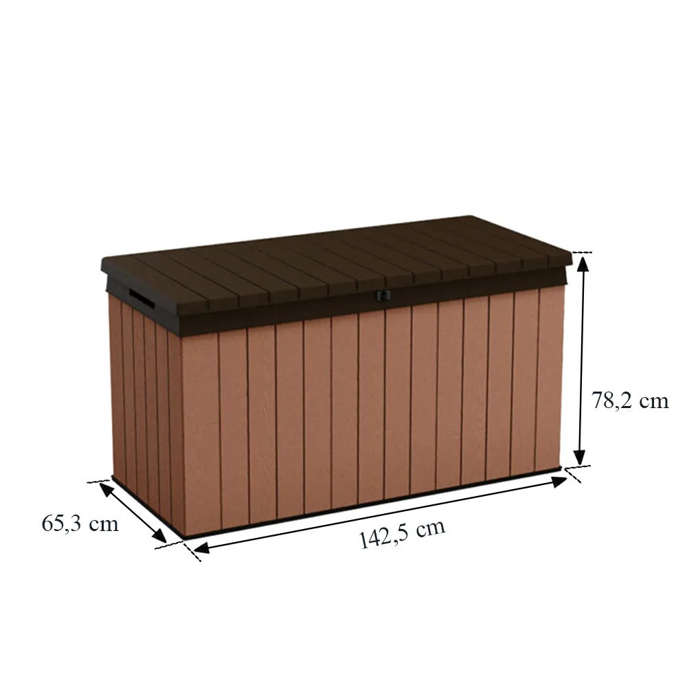 A funkcionális és tágas , 570 liter űrtartalmú kerti tárolót a neves Keter cég gyártotta, amelynek nagy tapasztalata van a műanyagból készült kerti felszerelések létrehozásában. A kerti tároló tökéletes hely a kerti székek, játékok vagy egyéb kerti felszerelések párnáinak tárolására. Noha fa kerti doboznak tűnik , ez csak egy stilisztikai eljárás, amelyet a gyártási folyamat során hajtanak végre. A Keter Darwin kerti tároló teljes egészében erős és tartós műanyagból készül. Ennek köszönhetően vízálló, ellenáll az UV sugárzásnak és környezetbarát is. A Keter termékek előállításához szükséges anyagok nagy részét újrahasznosításból nyerik.