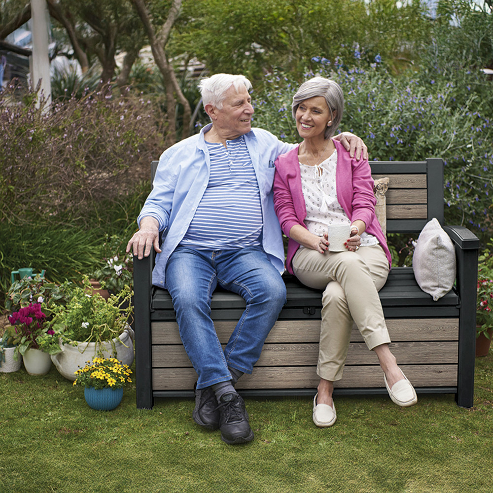 Akár a teraszon, akár a kert közepén helyezed el, a padként is funkcionáló tároló mindig kényelmes ülőhelyet biztosít két felnőtt számára — legyen szó reggeli kávéról vagy esti borozásról a csillagos ég alatt.