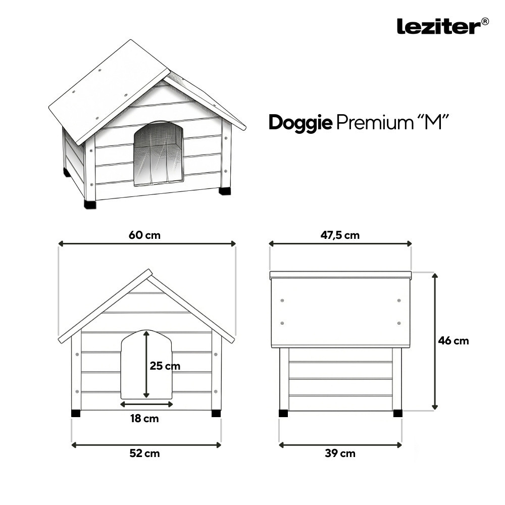 A Leziter Doggie Premium kutyaház háromrétegű falszerkezettel készül, amely fenyőfából, EPS habból és rétegelt lemezből áll. A szigetelés a két oldalfalban kap helyet, ami hozzájárul ahhoz, hogy a kutyaház belső tere mérsékeltebb hőingadozással működjön, és védelmet nyújtson a hűvösebb időszakokban. A stabil fa szerkezet és a rétegzett kialakítás tartós, megbízható megoldást jelent a mindennapi használat során. Az A+ osztályú laminált padló strapabíró felületet biztosít.
