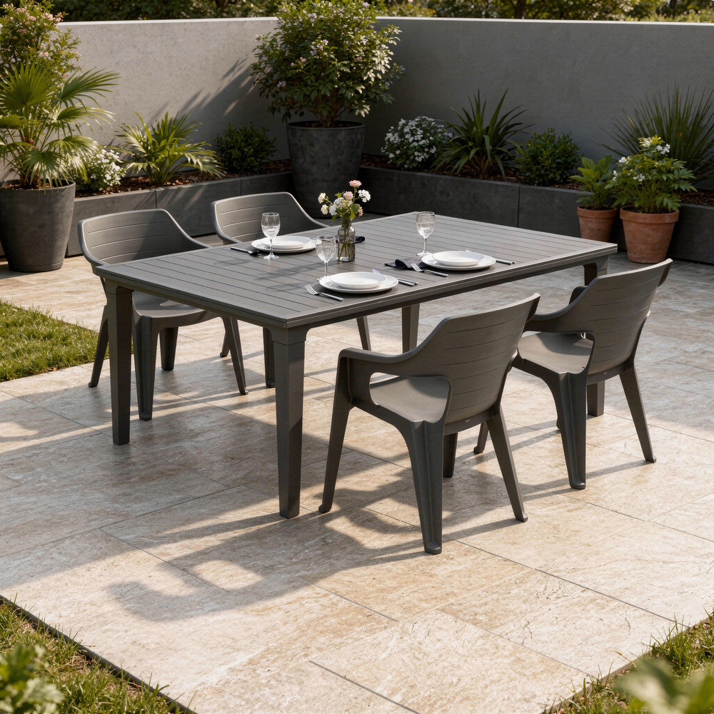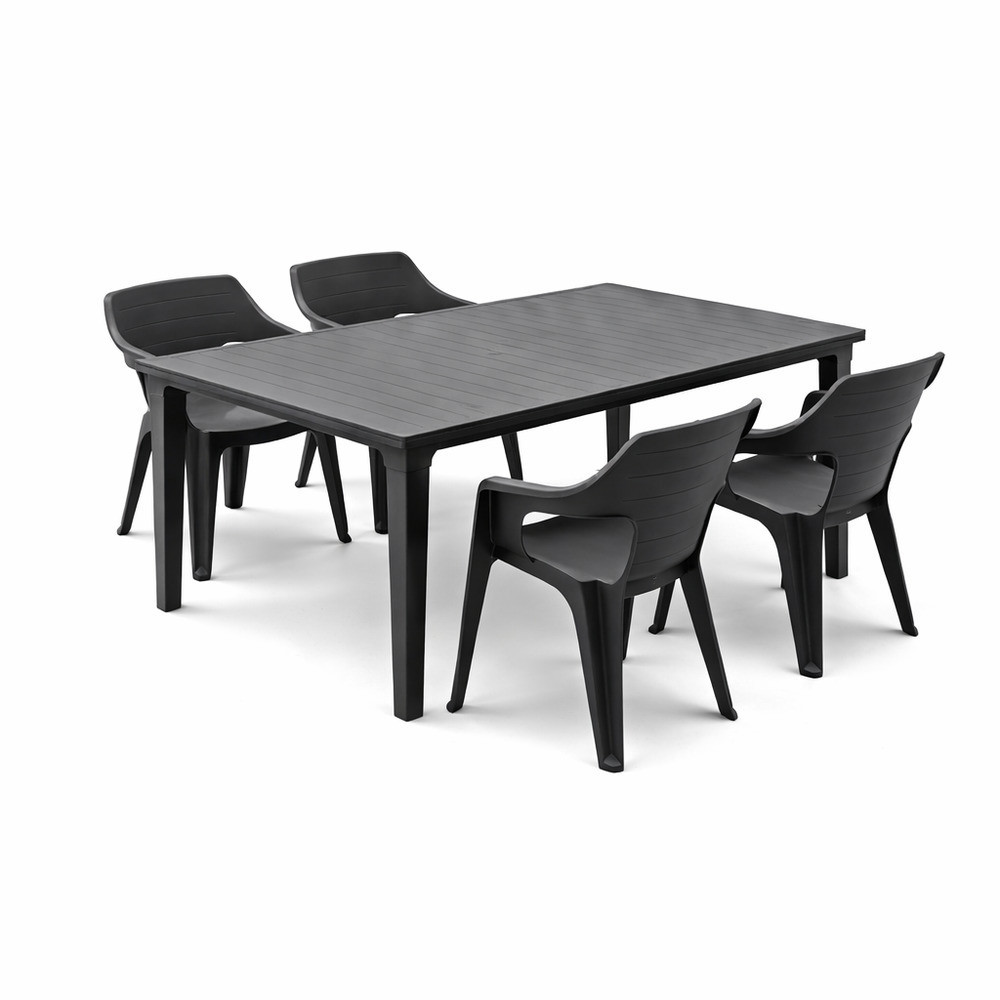 Az Elina 4+1 kerti bútor garnitúra szett grafit színben ideális választás, ha egy tágas, praktikus és elegáns kültéri étkezőszettet keresel teraszra, kertbe vagy nagyobb erkélyre.