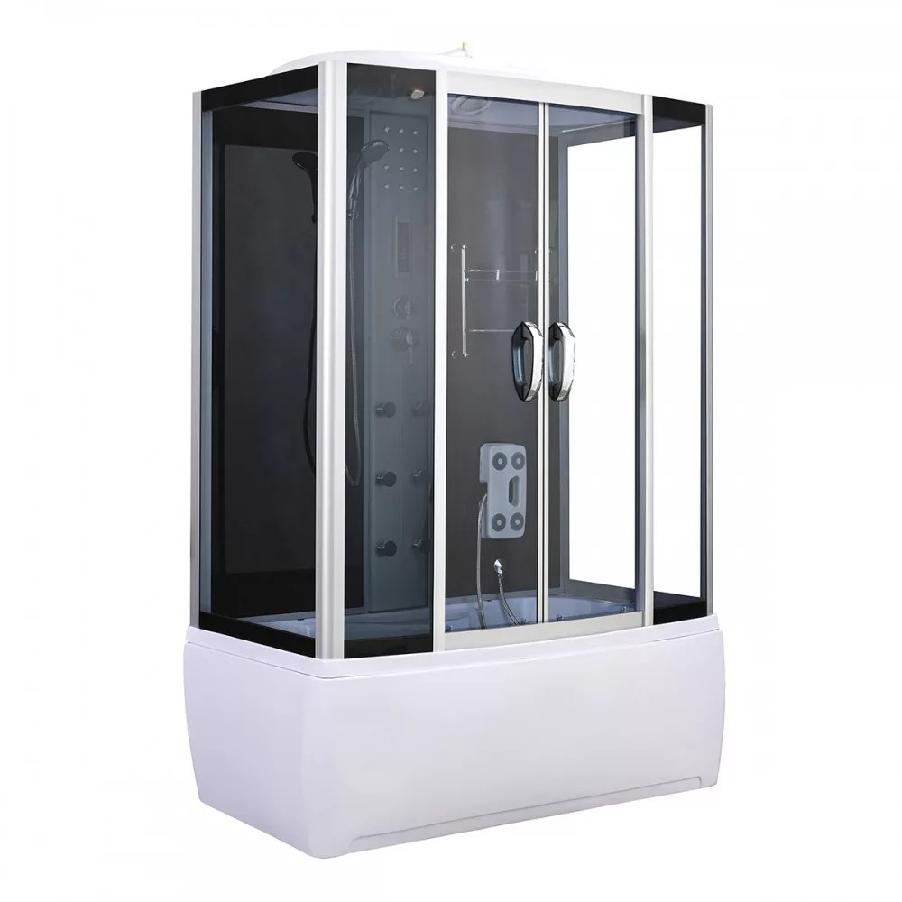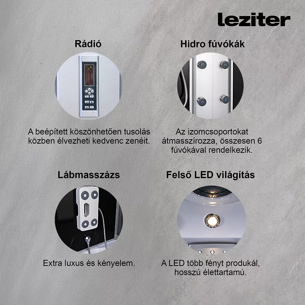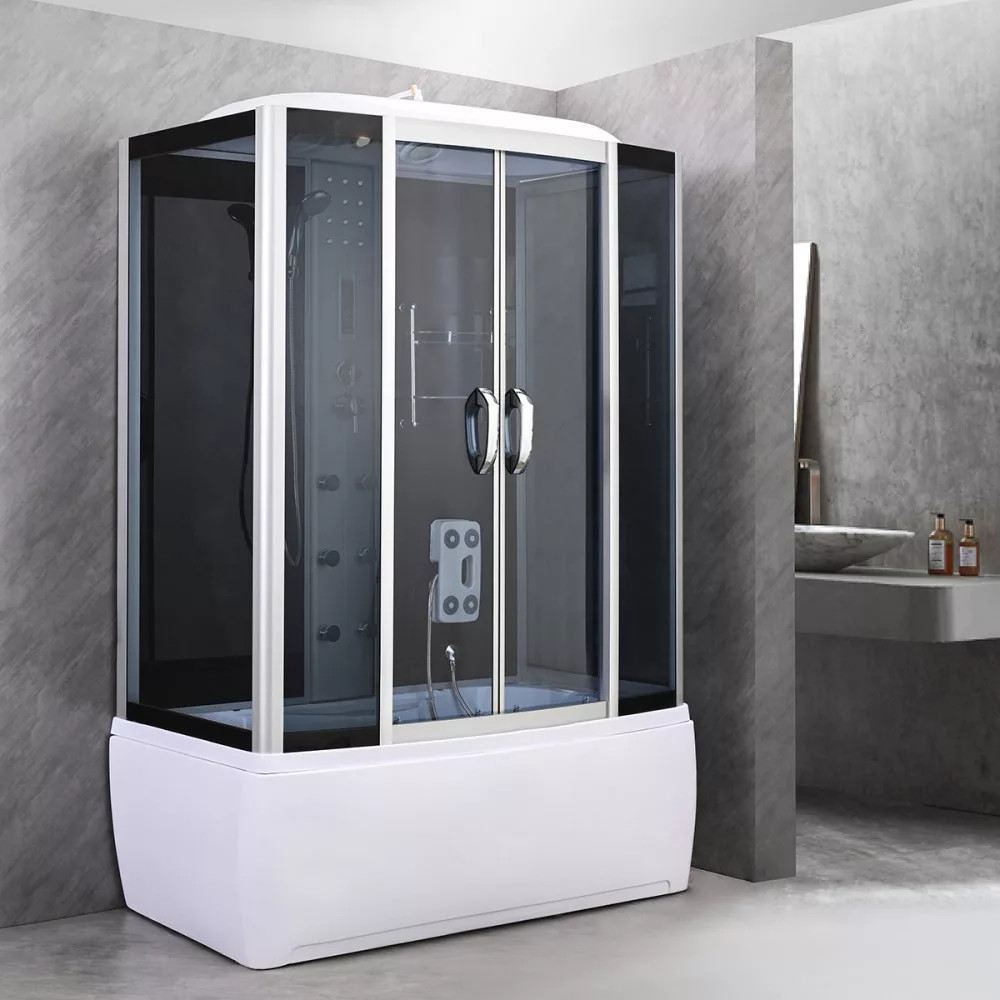 A kabint 5 mm vastag edzett biztonsági üveg veszi körül, amely sötétszürke fix üveg- és ajtópanelekkel, illetve fekete üvegfalakkal fokozza az esztétikai megjelenést. A matt króm vezetősínek és profilok tovább emelik a termék eleganciáját, míg a matt króm funkciópanel a vezérlési lehetőségek középpontjában áll. A kabin 6 hidromasszázs fúvókával rendelkezik, amely garantálja az egész testet átölelő masszázsélményt, miközben a beépített rádió, ventilátor, LED háttérvilágítás és felső világítás tovább fokozza a relaxáció élményét.