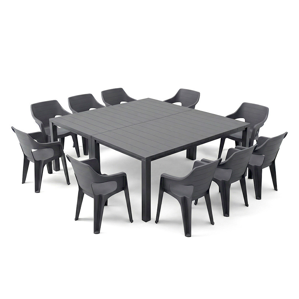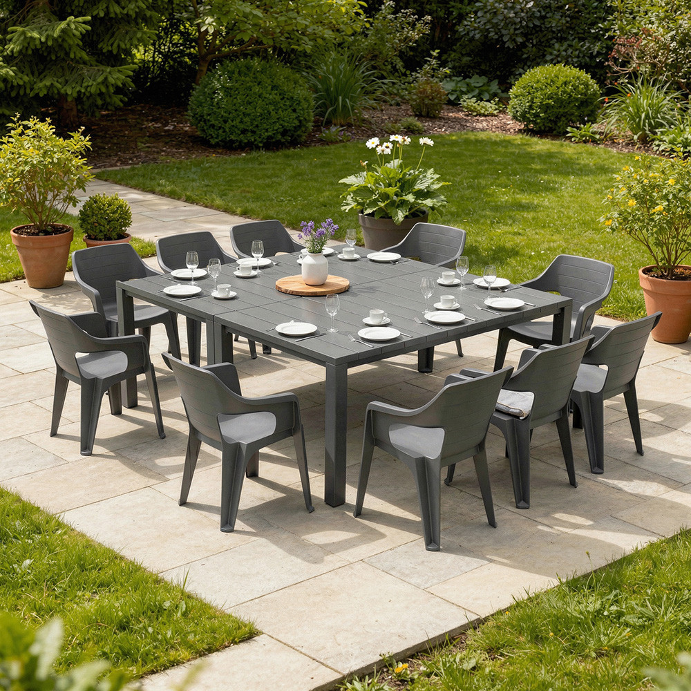 A Florin 10+1 kerti bútor garnitúra szett grafit színben ideális választás, ha sok ülőhelyre, rugalmasan használható asztalra és praktikus kültéri bútorokra van szükséged.