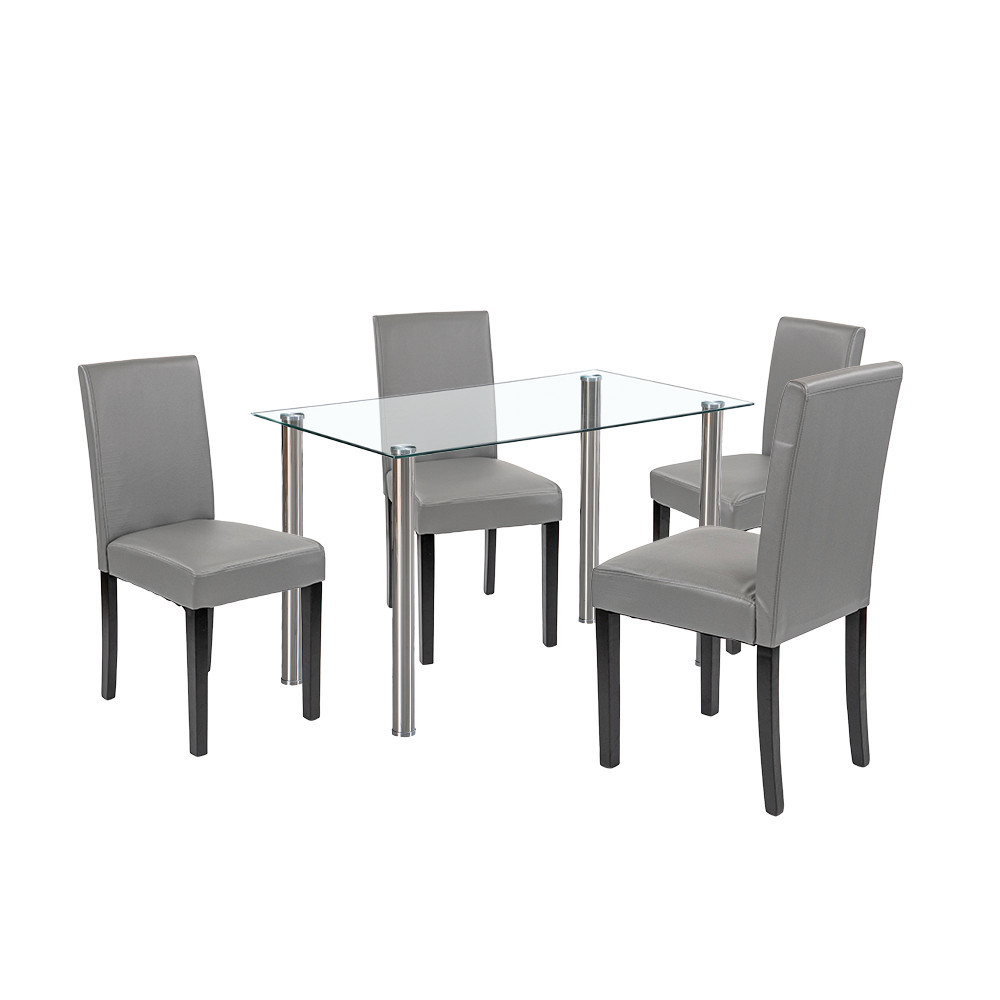A szett négy darab Leziter Kelly széket is tartalmaz, amelyek szürke ECO bőr kárpitozással készültek. Az elegáns megjelenés mellett ezek a székek rendkívül könnyen tisztíthatók. A 4 cm vastag habszivacs ülőfelület hosszabb étkezések során is komfortot nyújt, a stabil fenyőfa lábak pedig 120 kg teherbírással garantálják a hosszú távú megbízhatóságot.