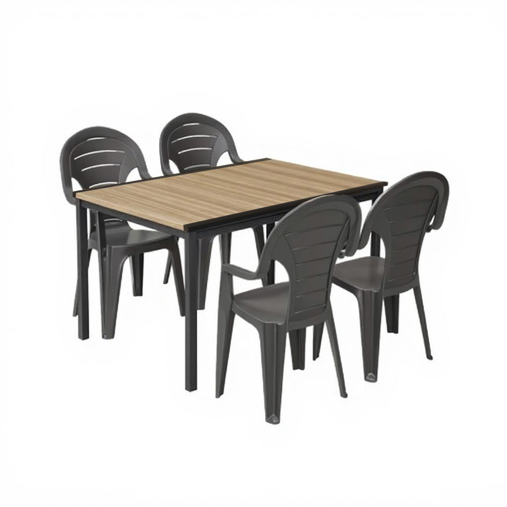 A székek ergonomikus formája kényelmet biztosít hosszabb használat során is, míg az asztal DecoCoat™ technológiával készült fa hatású felülete természetes látványt nyújt – gondozás nélkül.