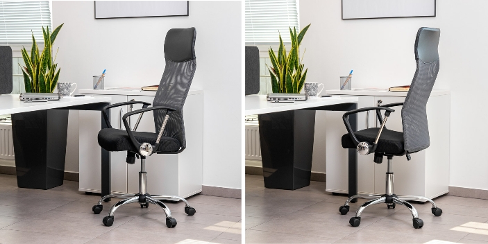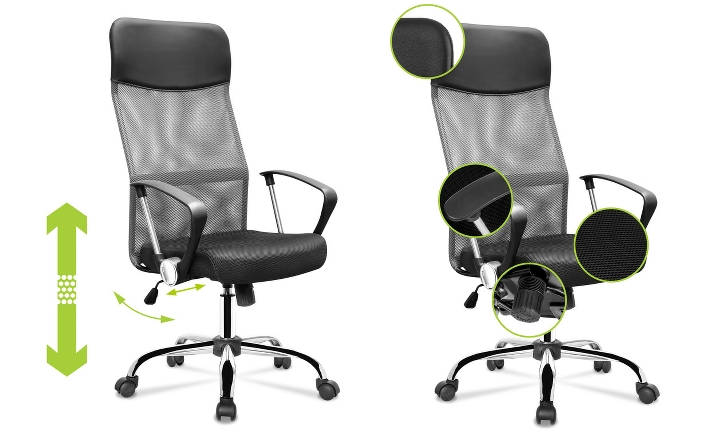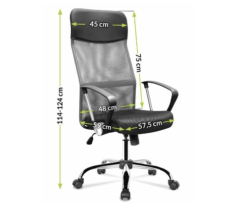 A forgószék ergonómikusan kialakított háttámlával rendelkezik, amely ideális támaszt jelent a gerinc számára, és beépített magas fejtámlával rendelkezik, amely biztosítja a kényelmet a használat során. A beépített kartámaszok növelik a test stabilizálódását és megkönnyítik a karokat és a vállakat. A forgatható irodai szék ülése kiváló minőségű mesh hálóból készül, amelynek fő előnye a légáramlás biztosítása a hát és a háttámla között. Az ülés anyaga nagyon tartós, és a szék tisztítása egyszerű. További előny a gázlift, amely lehetővé teszi az ülés magasságának beállítását, a felhasználóhoz igazítva.