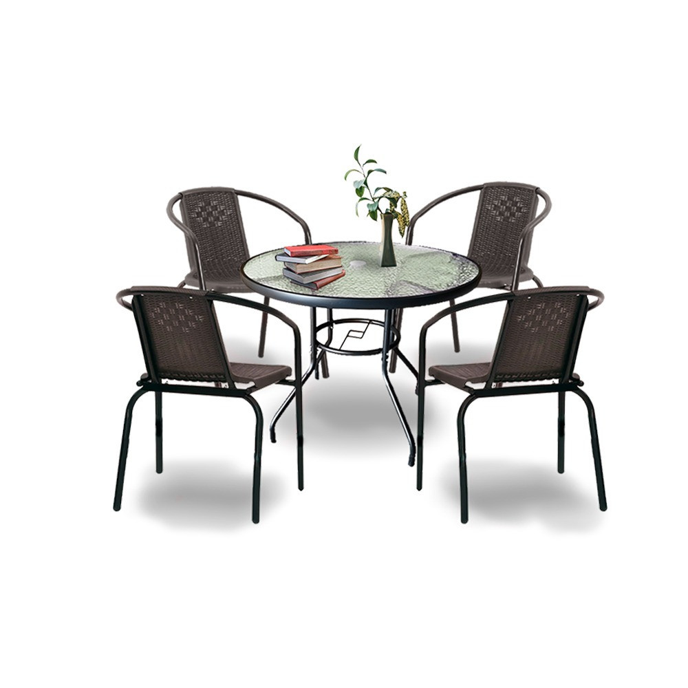 A modern kivitelű kerti bútorkészlet egy kerti üveglapos asztalt és 4 széket tartalmaz. A bútorokat 4 fő számára tervezték. A székek és az asztal lábazata acélból készül. Az asztallap 5 mm-es edzett üvegből készült, amely ellenáll a kisebb karcolásoknak. A műanyag szék ülésanyaga ellenáll az időjárási viszonyoknak. Előnye az ergonómikusan profilált ülés és karfa, amelyek tehermentesítik a vállakat pihenés közben.