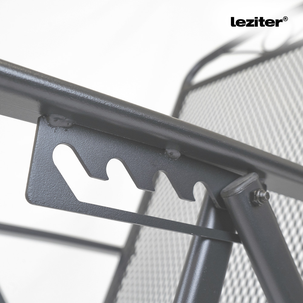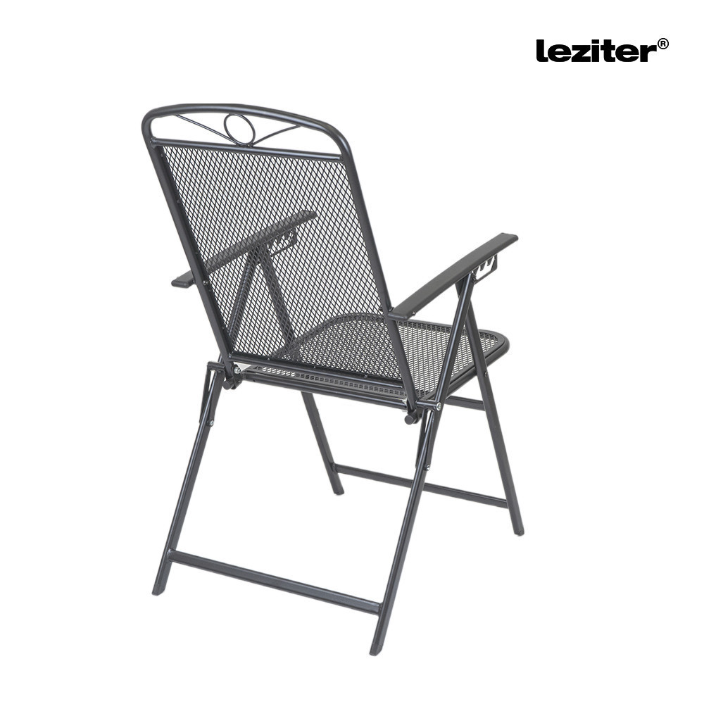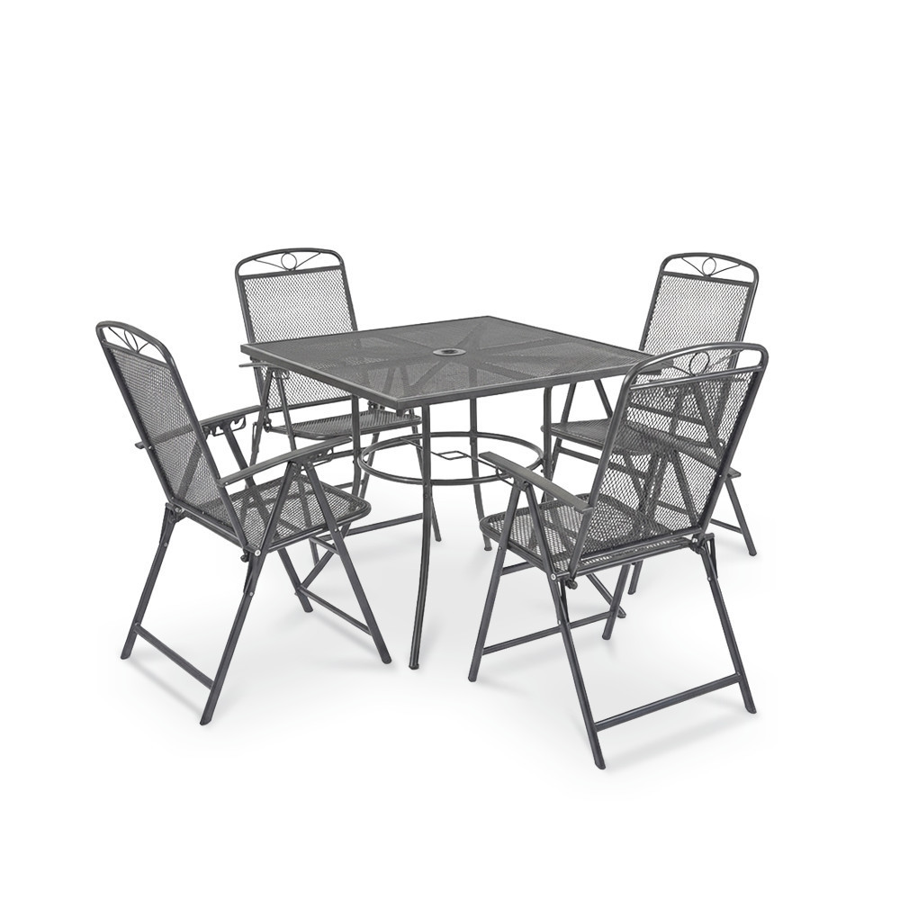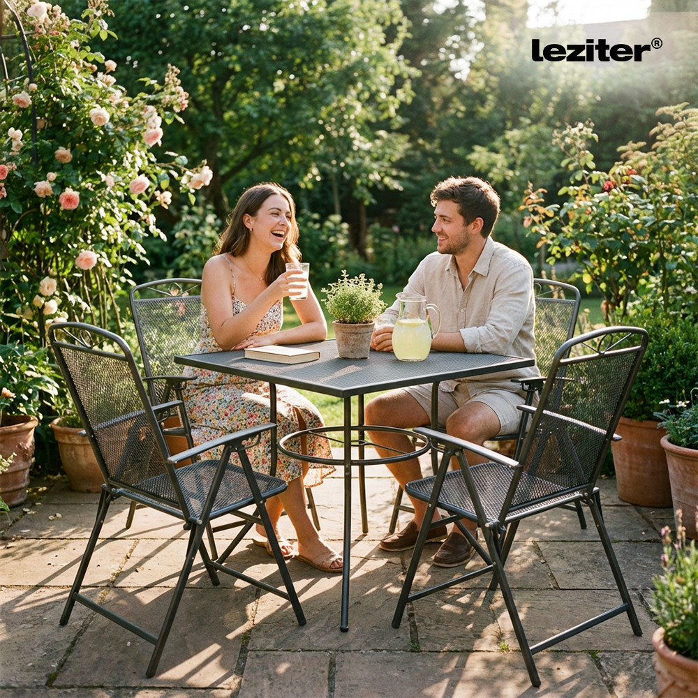 A Leziter Mali 4+1 kerti bútor garnitúra szett antracit színben egy négyzet alakú Melfi kerti asztalt és 4 db Alba összecsukható kerti széket tartalmaz, stabil acél szerkezetével, korrózióálló és porszórt felületkezelésével, valamint modern hálós kialakításával praktikus és stílusos megoldást kínál kertbe, teraszra vagy erkélyre.