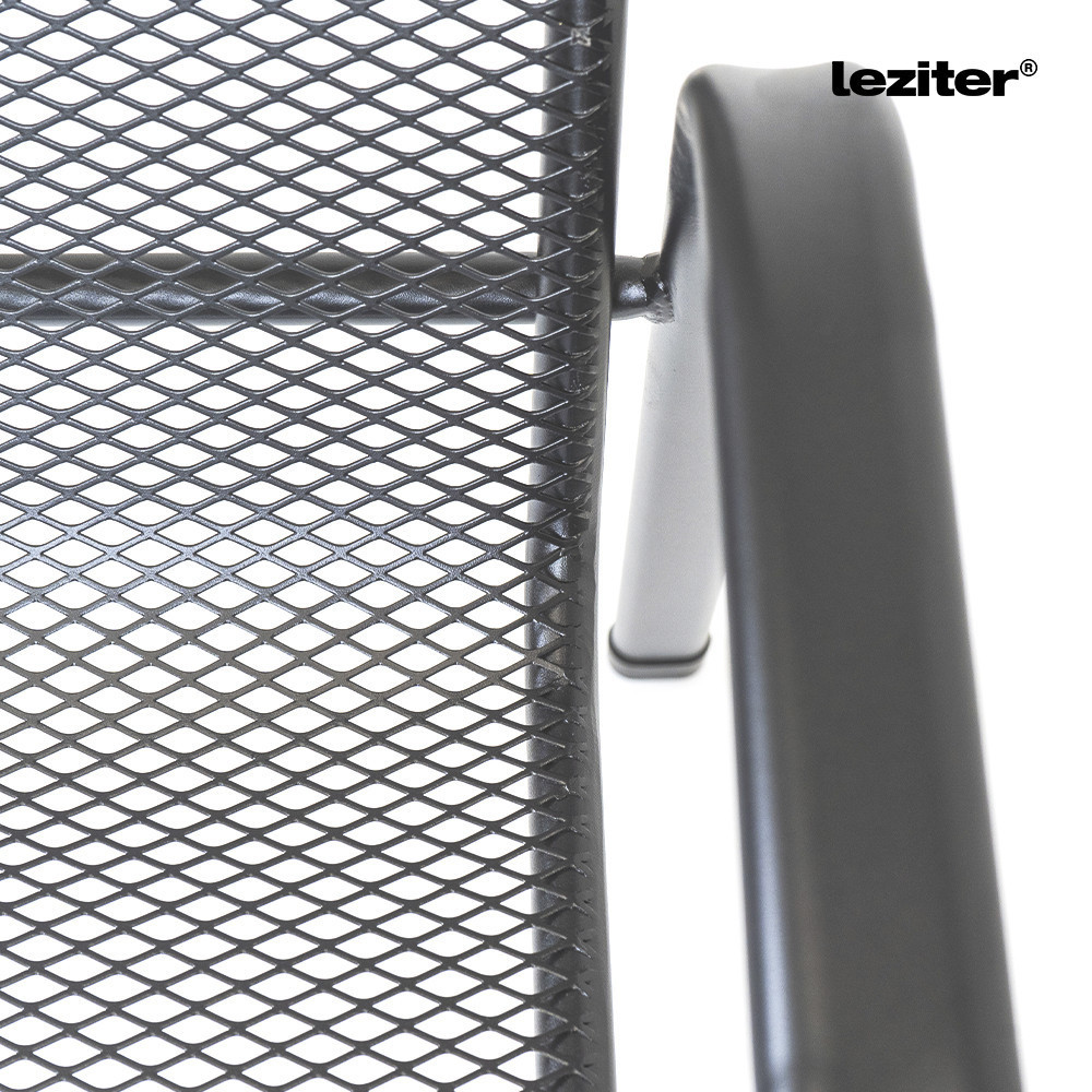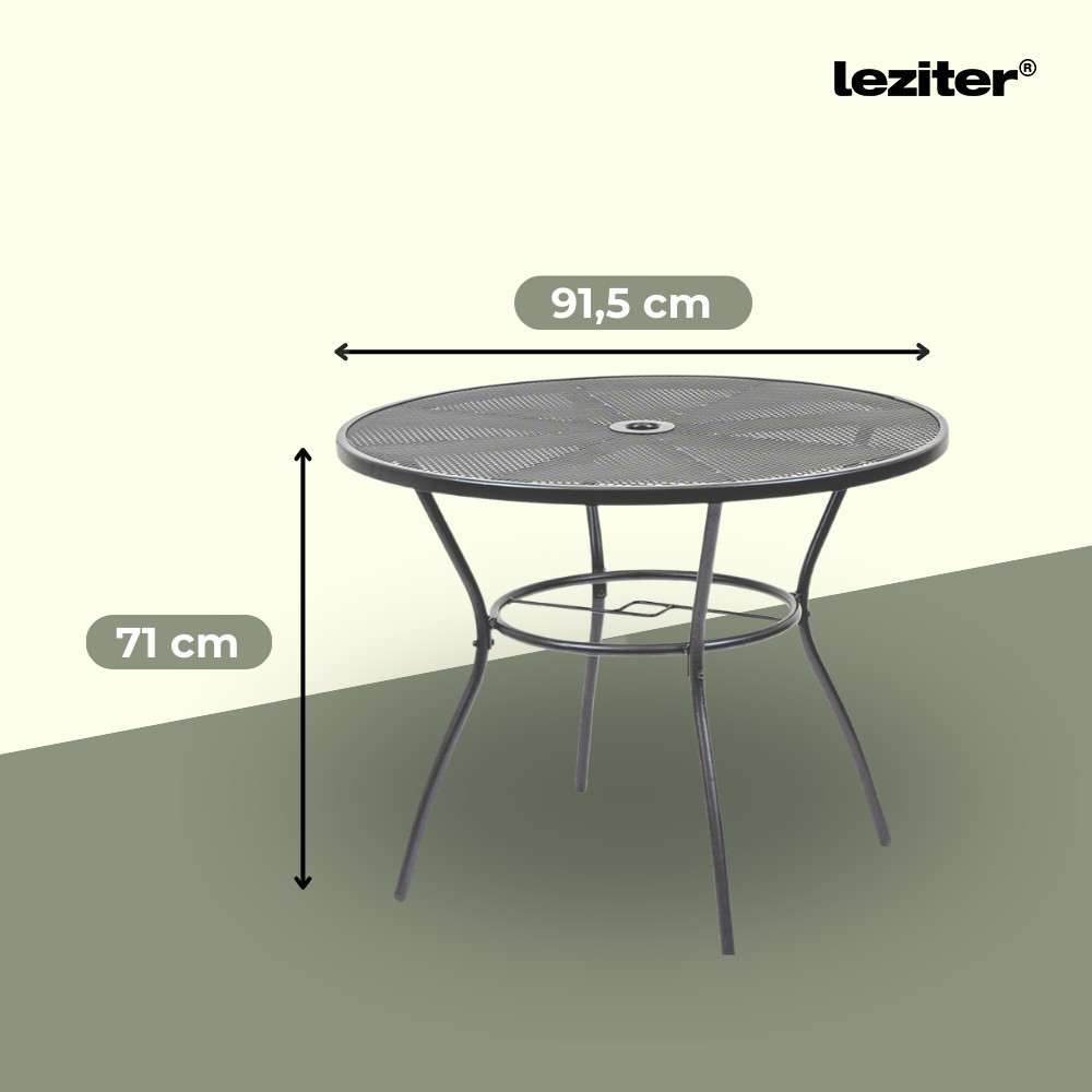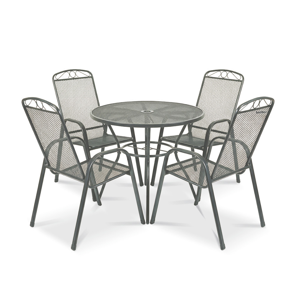 A Leziter Melko 4+1 kerti bútor garnitúra szett antracit színben egy Arko kerek kerti asztalt és 4 db kényelmes Melfi karfás széket tartalmaz, stabil acél szerkezetével, korrózióálló és porszórt felületkezelésével, valamint modern hálós kialakításával tartós és stílusos megoldást kínál kertbe, teraszra vagy erkélyre.