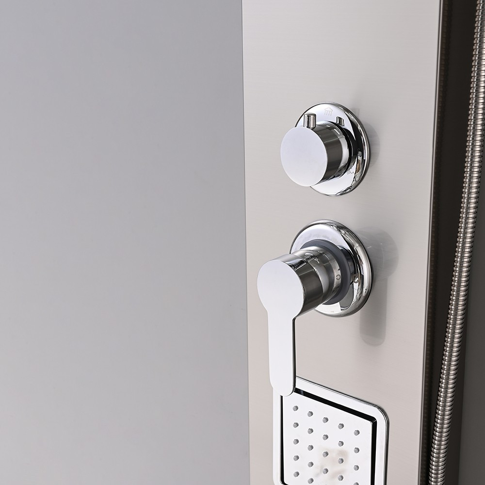 A zuhanypanel további funkciói közé tartozik egy vízesés, amely egy másik különleges élményt nyújt. A vízesésnek köszönhetően a víz folyik lefelé az ember hátára, kellemes masszázsszerű hatást nyújtva, és feloldva az izmok feszültségét. A vízesés funkcióval kombinálva hátsó fúvókák találhatók a zuhanypanelen, amelyek különösen jótékony hatással vannak a hátmasszázsra. A zuhanypanel további kényelmi funkcióval rendelkezik egy kézi zuhannyal is, amely lehetővé teszi a célzottabb vízirányítást és a zuhanyozás személyre szabását. A kézi zuhany praktikus, ha nem szeretnénk beállni az esőztető vagy a vízesés alá, vagy ha csak a hajmosáshoz vagy a test adott részének tisztításához van szükségünk a zuhanyozás közben.