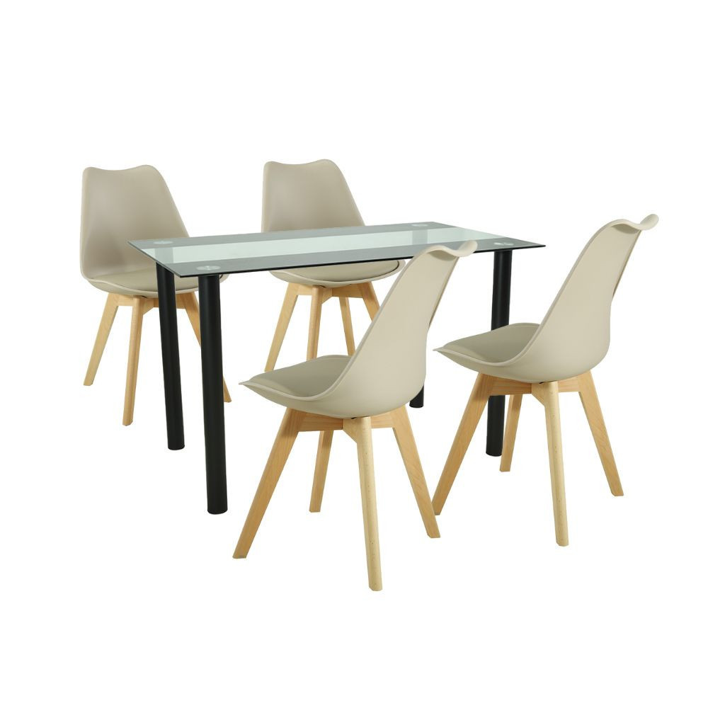 | Anyag | Edzett üveg asztallap, acél váz | Bézs PP ülőfelület, bézs PVC párnázat, bükkfa színű lábak |