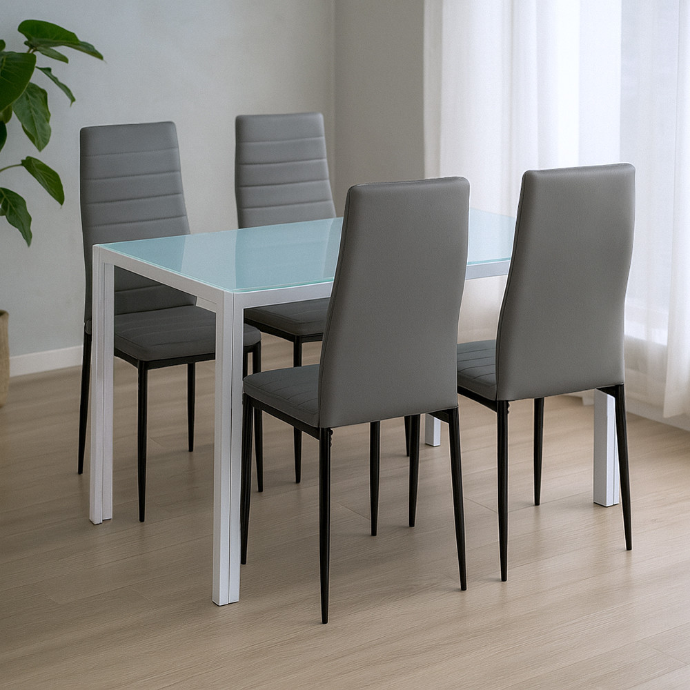 A Midland garnitúra modern, szürke-fekete szék és fehér üvegasztal színkombinációja szinte bármilyen enteriőrbe könnyedén illeszthető. Méretének köszönhetően kisebb és nagyobb étkezőkben is jól elfér.