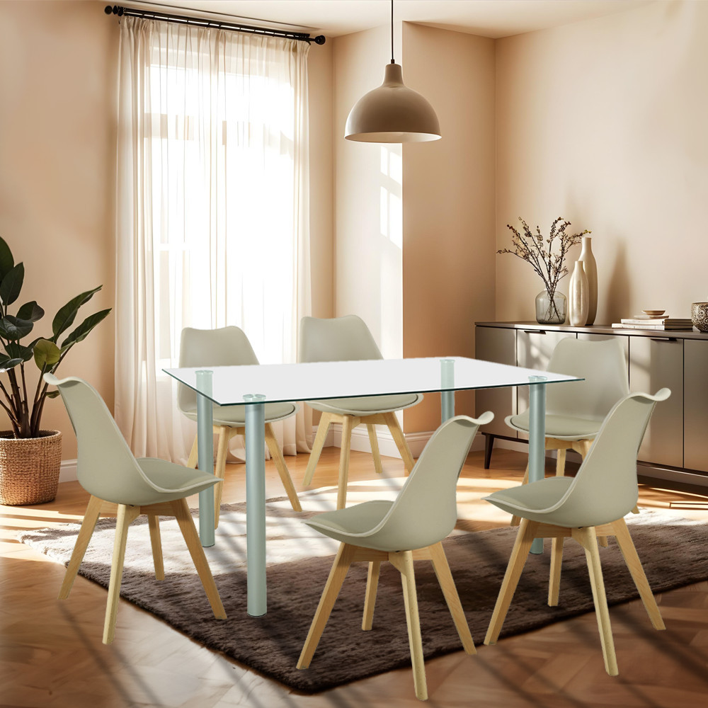 | Anyag | Hőkezelt üveglap, fém lábak | Bézs PP ülőfelület, PVC párnázat, bükkfa színű lábak |