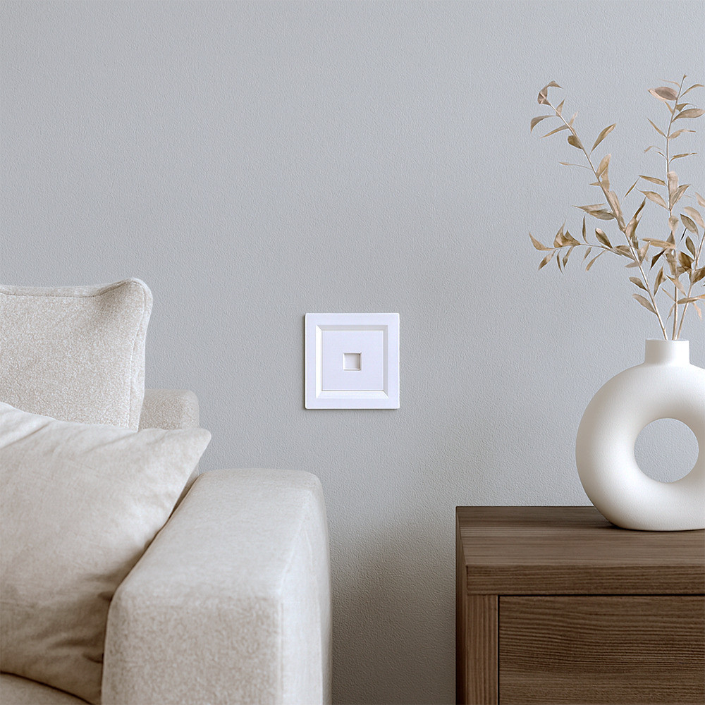 A termék gyárilag tartalmazza a fehér egyes keretet, így nem kell külön kiegészítőt vásárolni. A lekerekített élformájú, 83 × 83 mm-es méretű kialakítás modern és diszkrét megjelenést nyújt, amely bármilyen beltéri enteriőrbe harmonikusan illeszkedik.