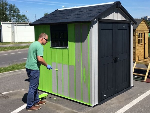 A falak bármilyen színűek lehetnek Az Oakland 1175 kerti ház szürke árnyalatú - a ház falai világosabbak, az ajtók, ablakok és a tető sötétebbek. A ház bármilyen színűre festhető tetszés szerint. A speciális anyag, amelyből készül, és a durva felület megkönnyíti a festék felszívódását és tartását. Javasoljuk, hogy festés előtt olvassa el figyelmesen az utasításokat. A ház festése azt jelenti, hogy elveszíti az áru visszaküldésének lehetőségét.