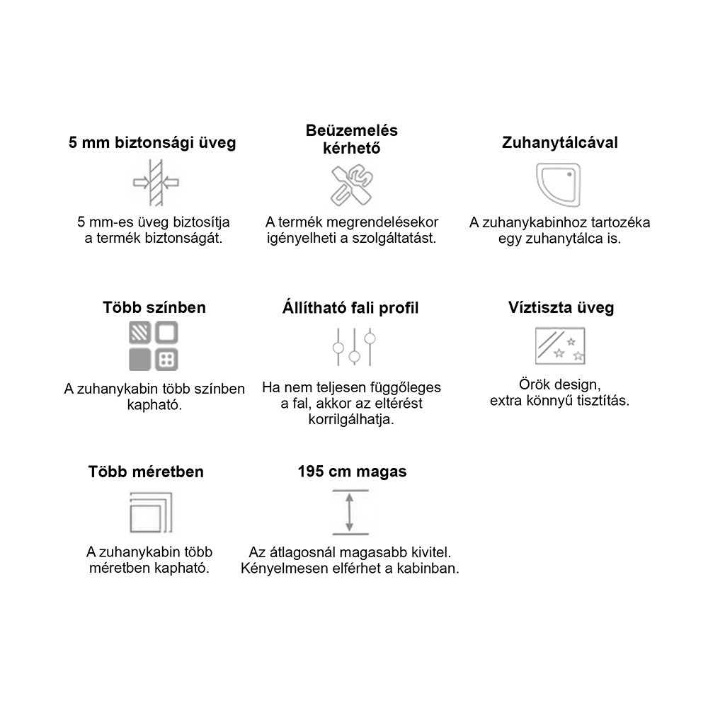 - Magasság: 195 cm (zuhanytálcával együtt)