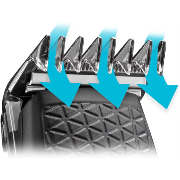 - Comfort Glide állítható fésűk 3–24 mm között (0,5 mm vágás fésű nélkül)