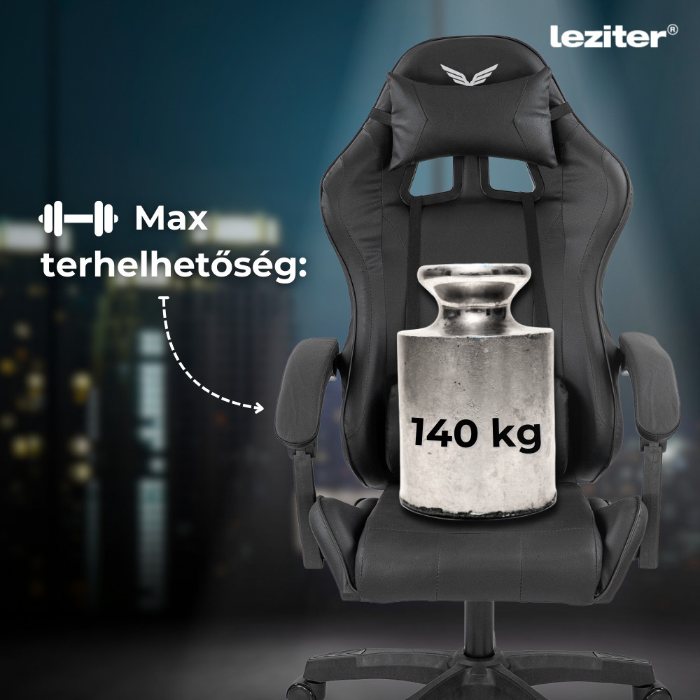 A Leziter Raven gamer irodai forgószék nemcsak látványos, hanem funkcionális is. A forgószék fekete színvilága és sportos, versenyautó-ülésre emlékeztető formatervezése modern megjelenést kölcsönöz bármilyen környezetben. Legyen szó gamer szobáról, irodáról vagy tanulósarokról, ez a stílusos gamer szék karaktert visz a térbe, miközben kényelmet és ergonomikus tartást biztosít.