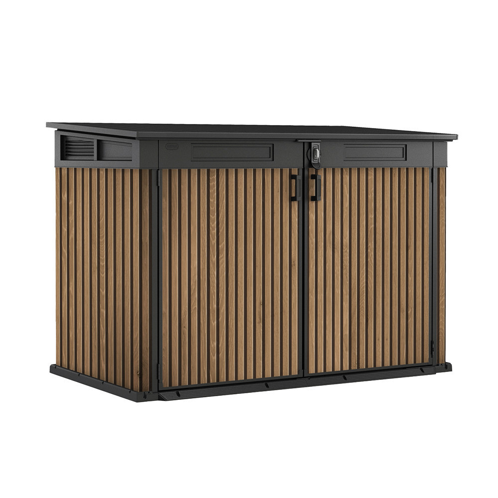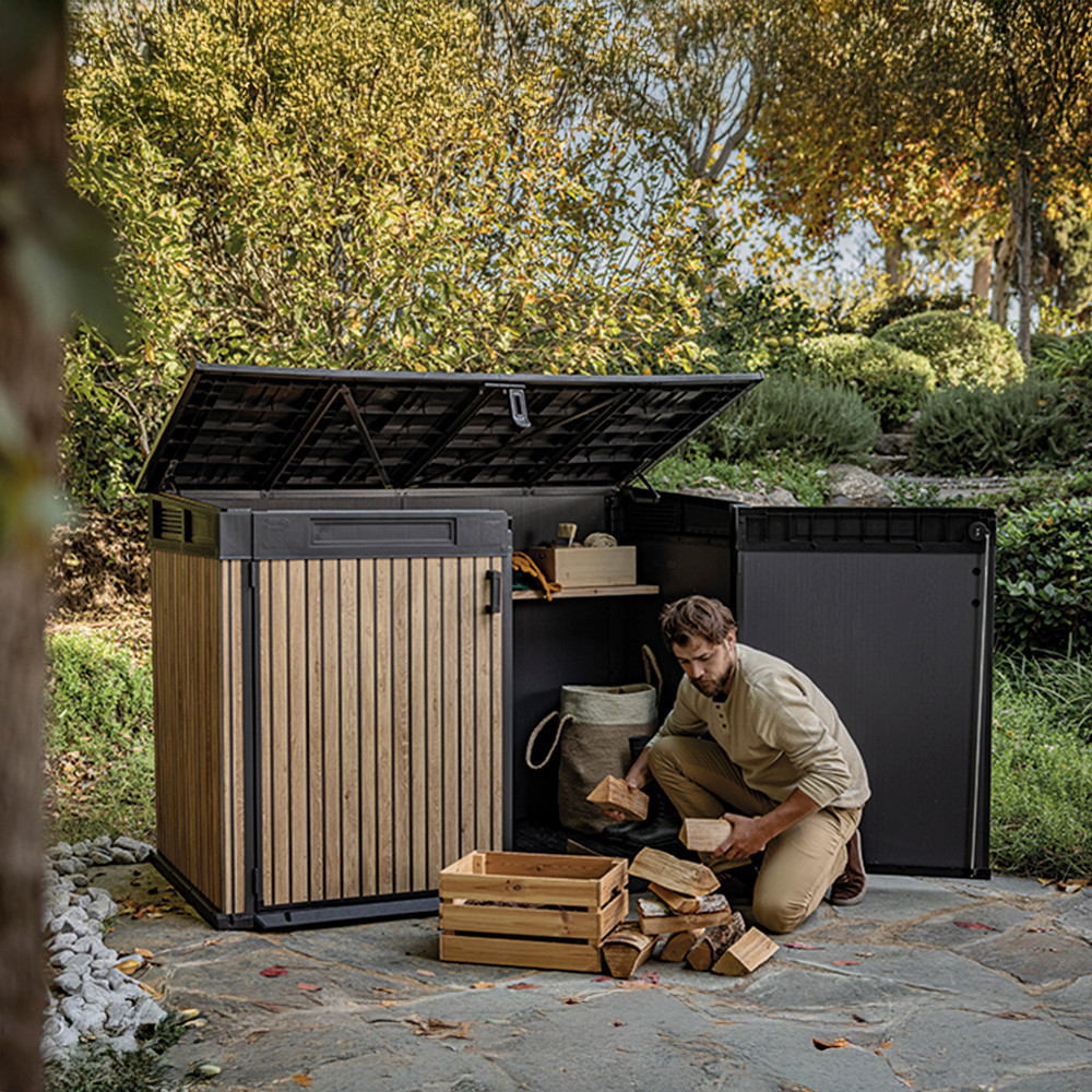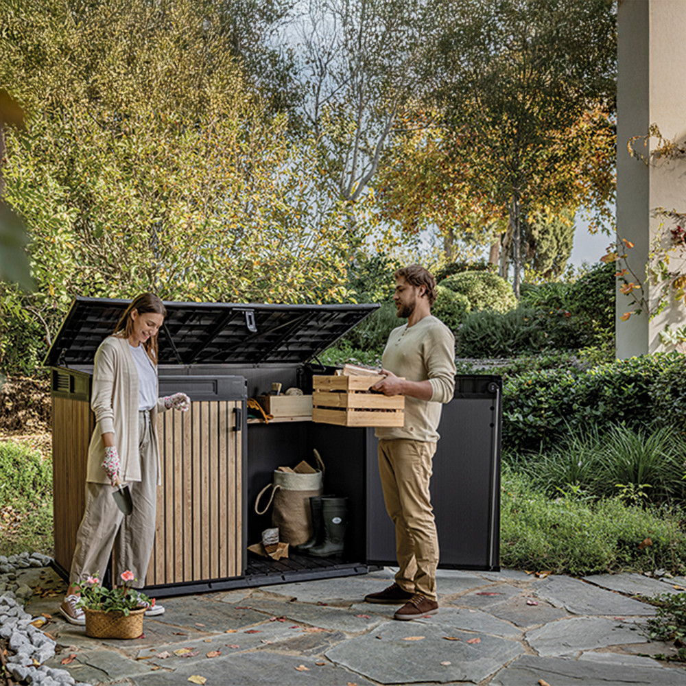 A DecoCoat™ technológia garantálja, hogy a tároló nem rozsdásodik, nem repedezik, és UV-álló felülettel rendelkezik. Az erős hidraulikus nyitószerkezet és fém zsanérok biztosítják a könnyed használatot és a hosszú élettartamot.