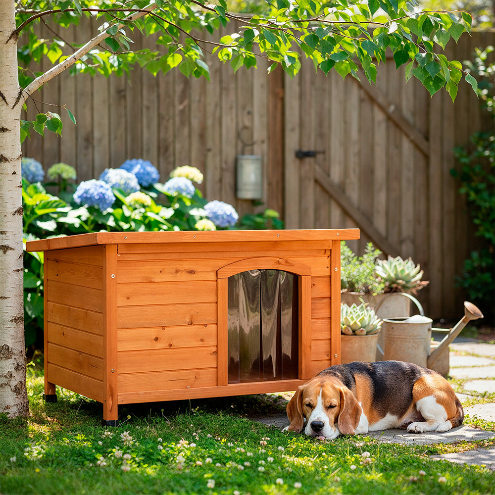 A lapostetős kivitel különösen előnyös szűkebb helyeken, ahol fontos a helytakarékos elhelyezés. A tetőt homokszórt bitumenes kátránypapír borítja, amely megbízható védelmet nyújt eső és nedvesség ellen. A lamellás műanyag ajtó csökkenti a huzatot, távol tartja a szelet és a csapadékot, miközben könnyű ki- és bejutást biztosít a kutyának.