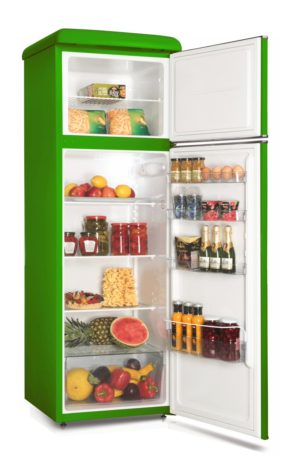 A kényelmes ajtópolcokon sok különböző méretű és formájú terméket tárolhat. A polcok magassága könnyen beállítható vagy teljesen eltávolítható.