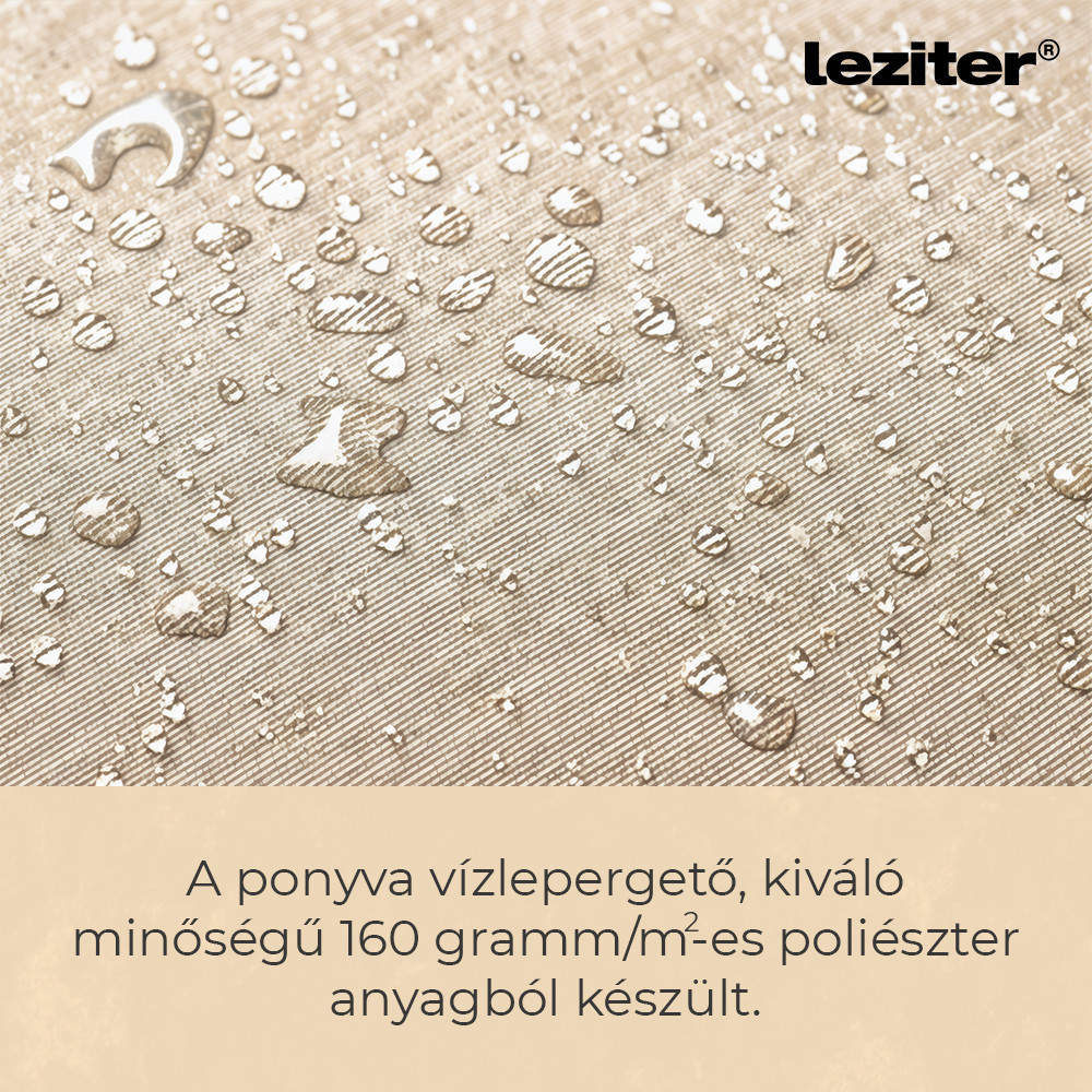 A Leziter Solari kerti napernyő 300 cm átmérőjű kialakítással rendelkezik, amely egyenletes lefedést biztosít a középoszlop körül. A kör alakú forma jól használható kertekben, teraszokon vagy kerti bútorok fölött. A ponyva kialakítása a mindennapi kültéri használathoz igazodik, felülete vízlepergető, így a nedvesség nem szívódik fel azonnal. A bézs szín világos, visszafogott megjelenést ad, amely könnyen illeszkedik különböző kültéri környezetekhez.