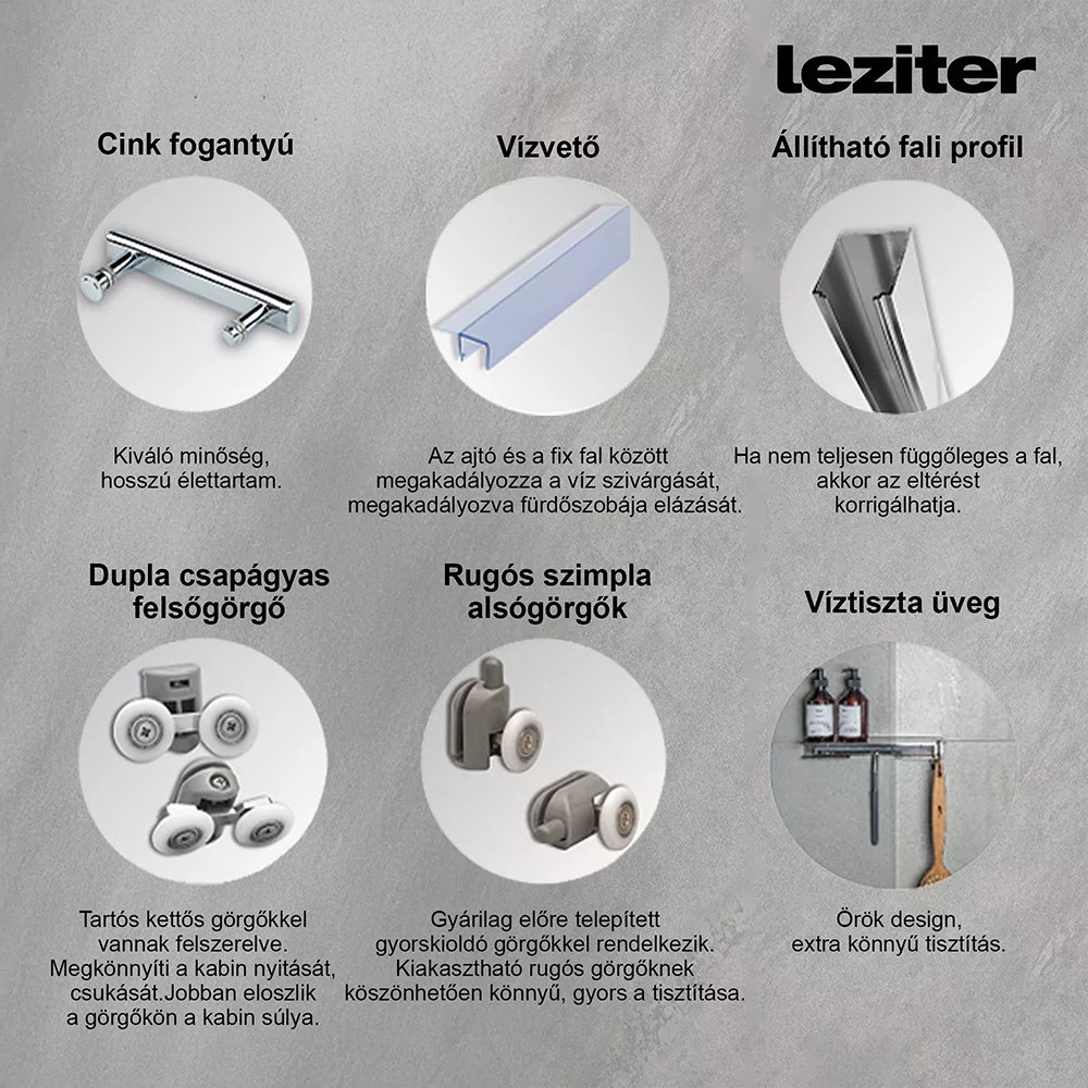 A Leziter Spirit Deep zuhanykabin üvege 4 mm vastag, edzett biztonsági üvegből készül, amely a hagyományos üvegnél jóval ellenállóbb és biztonságosabb. A sima, víztiszta felület ellenáll a vízkőnek és az ujjlenyomatoknak, és hosszú távon is megőrzi fényes, tiszta megjelenését. Az edzett üveg törés esetén apró, tompa szilánkokra esik szét, így biztonságos választás a mindennapi használatban, akár családok számára is.