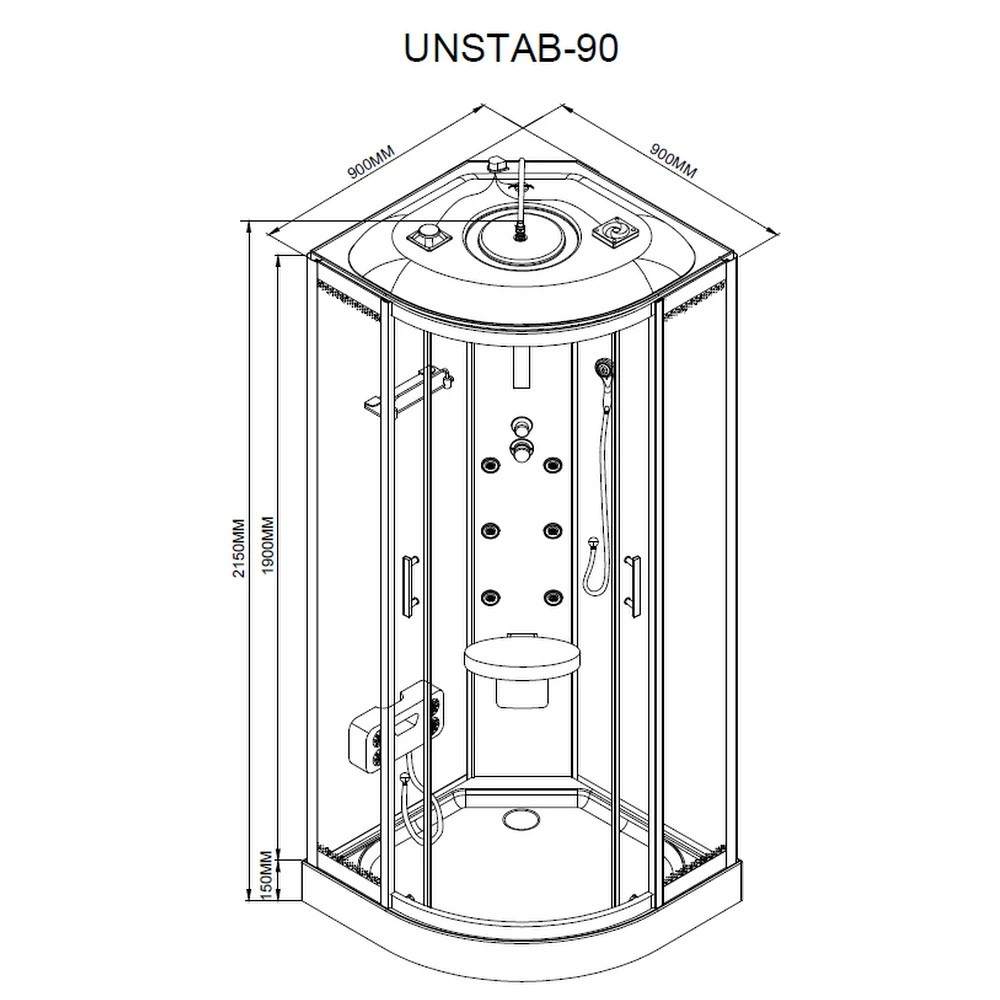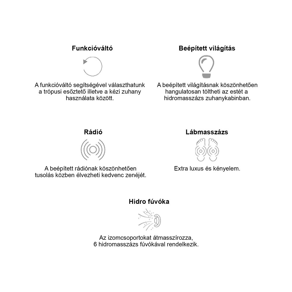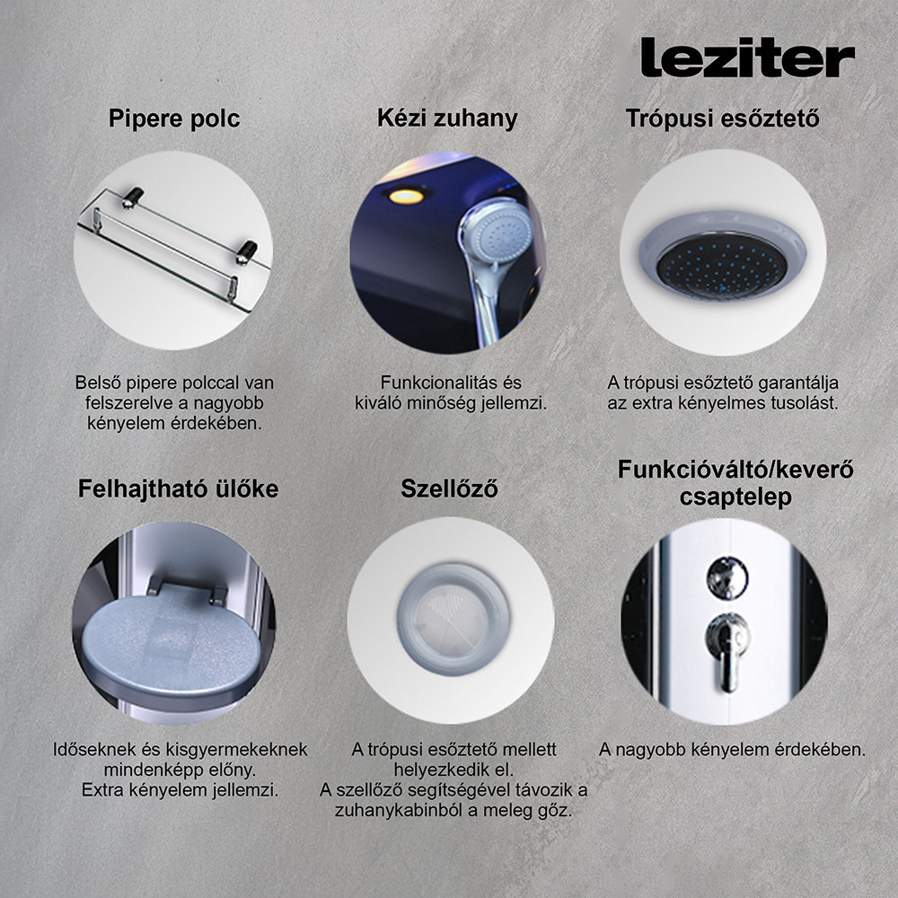 A zuhanykabin 6 hátmasszírozó fúvókával van felszerelve. Az alumínium hátsó panel és a beépített elektronika, kezelőpanel, rádió és hangszórók lehetővé teszik, hogy minden zuhanyzás egy igazi élménnyé váljon. A hátsó és felső hangulatvilágítás, valamint a felső világítás tovább fokozza a relaxációt, miközben a praktikus piperepolc és a lábmasszírozó gondoskodik a maximális kényelemről.