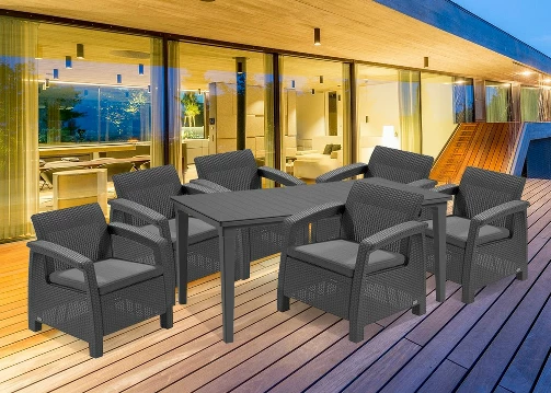 A Corfu Big Duo kerti bútor garnitúra szett egy elegáns és kényelmes kerti bútor kompletten. Az eredeti, rattanra emlékeztető felület még a legigényesebb felhasználó igényeit is kielégíti. UV sugárzásnak és az időjárás viszontagságainak ellenálló műanyagból készült. Könnyű tisztán tartani, összeszerelése egyszerű.