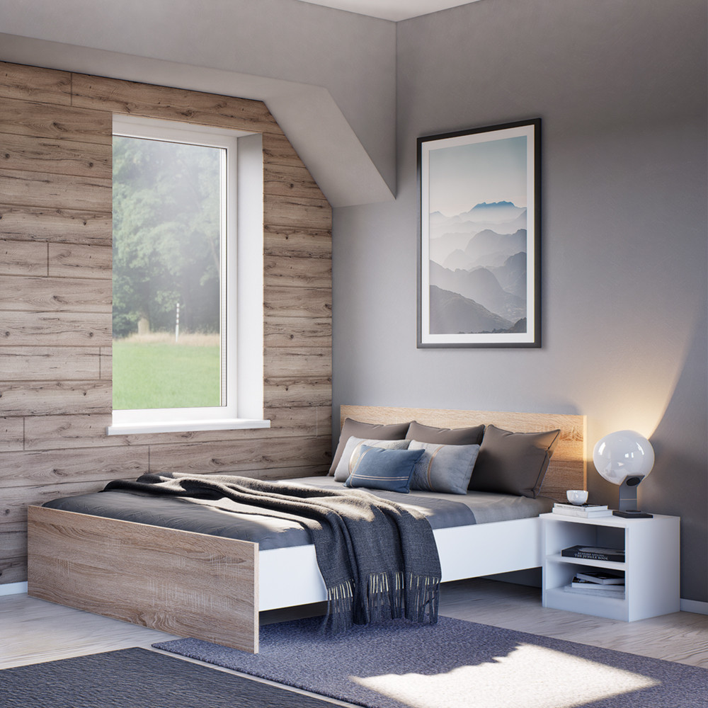 | Anyag | Kiváló minőségű bútorlap, fehér oldallappal, sonoma tölgy fejvéggel és ágyvéggel. |