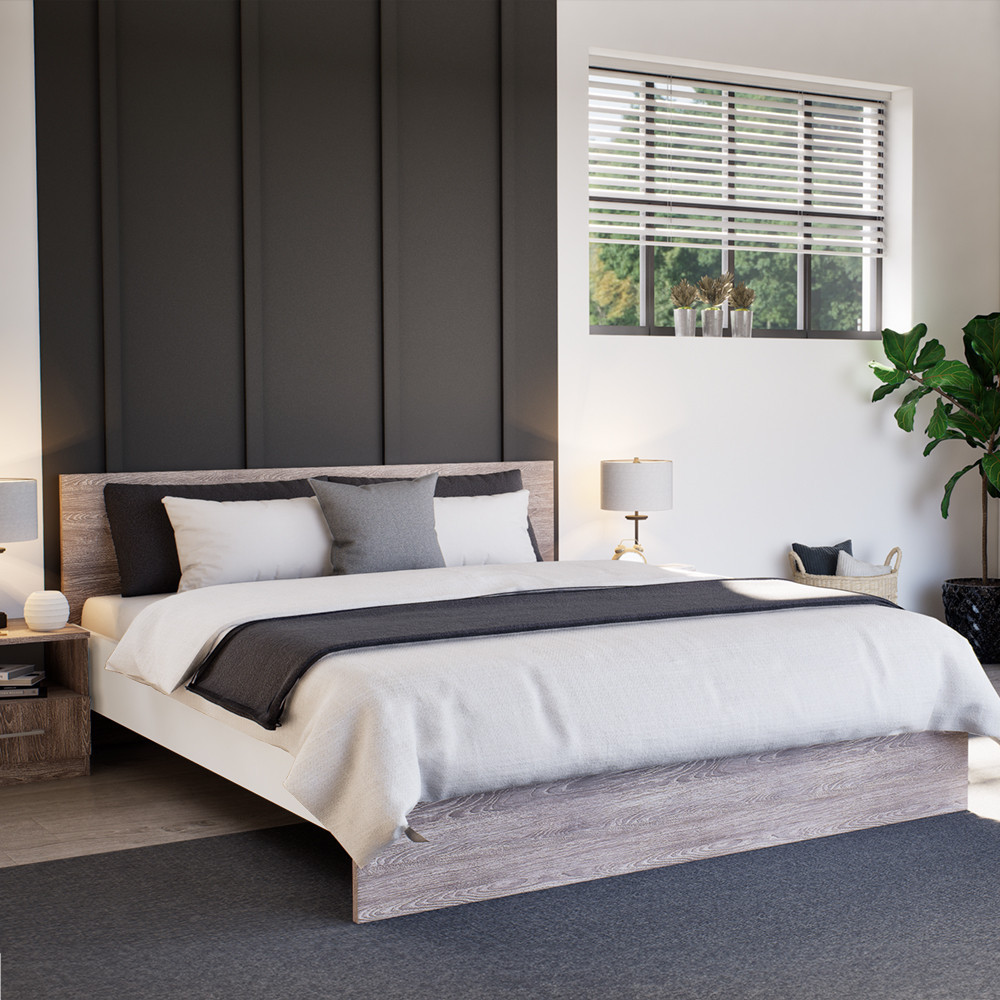 Esztétikum: A fahatású oldallapok és fej-/ágyvégek modern és elegáns megjelenést kölcsönöznek az ágynak, amely könnyedén illeszkedik a legtöbb hálószoba stílusához.
