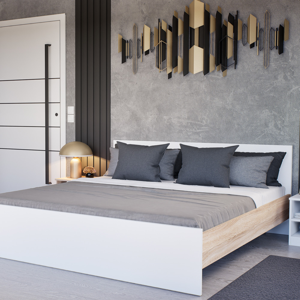 | Anyag | Kiváló minőségű bútorlap, sonoma tölgy oldallappal, fehér fejvéggel és ágyvéggel. |